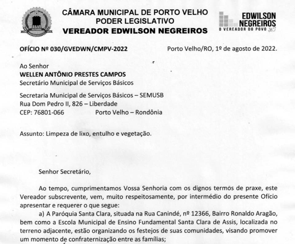 Mais uma diligência foi deflagrada pela Prefeitura de Porto Velho após pedido expedido pelo Gabinete do vereador Edwilson Negreiros, do PSB.