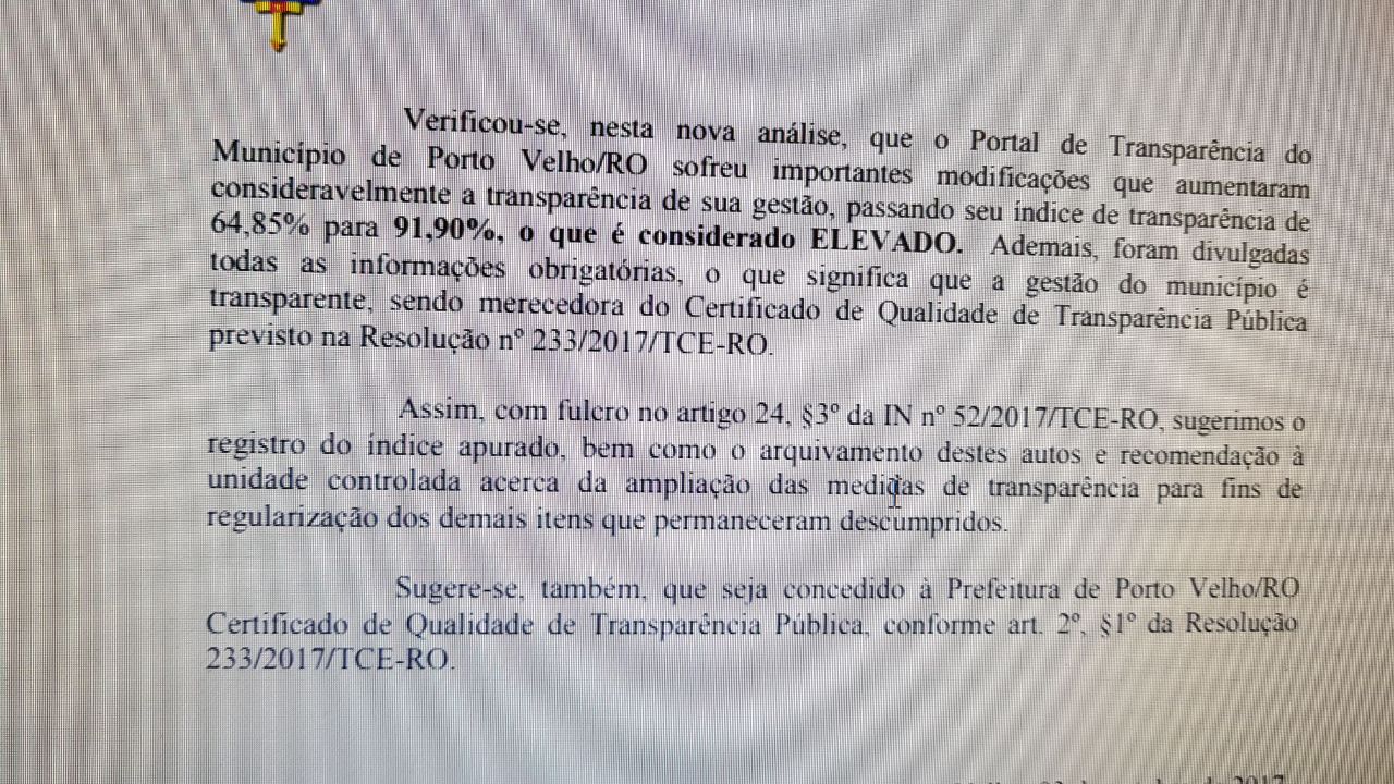 O TCE também afirma que “foram divulgadas todas as informações obrigatórias, o que significa que a gestão do Município é transparente, sendo merecedora do Certificado de Qualidade de Transparência Pública previsto na Resolução nº 233/2017/TCE-RO”, diz outro trecho do documento.