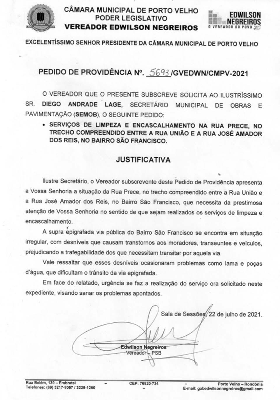 “A situação irregular na Rua Prece ocasionava diversos transtornos aos moradores, transeuntes e motoristas. Até há pouco tempo havia ali acúmulo de lama e poças d’água em diversos pontos. Com o trabalho da Prefeitura de Porto Velho, que estamos acompanhando pessoalmente, o problema começa a ser sanado”, destacou Negreiros.