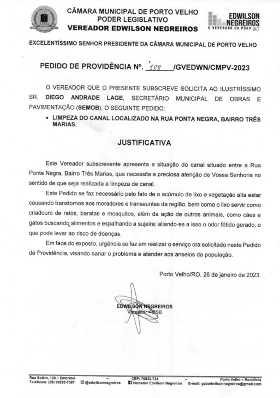 O pedido de providências se referia à limpeza de um canal situado na Rua Ponta Negra, um ponto crítico que preocupava a população local. As condições insalubres do canal, marcadas pelo acúmulo de lixo e vegetação alta, apresentavam riscos à saúde dos moradores e transeuntes da região, transformando o local em um potencial criadouro de vetores de doenças como ratos, baratas e mosquitos.