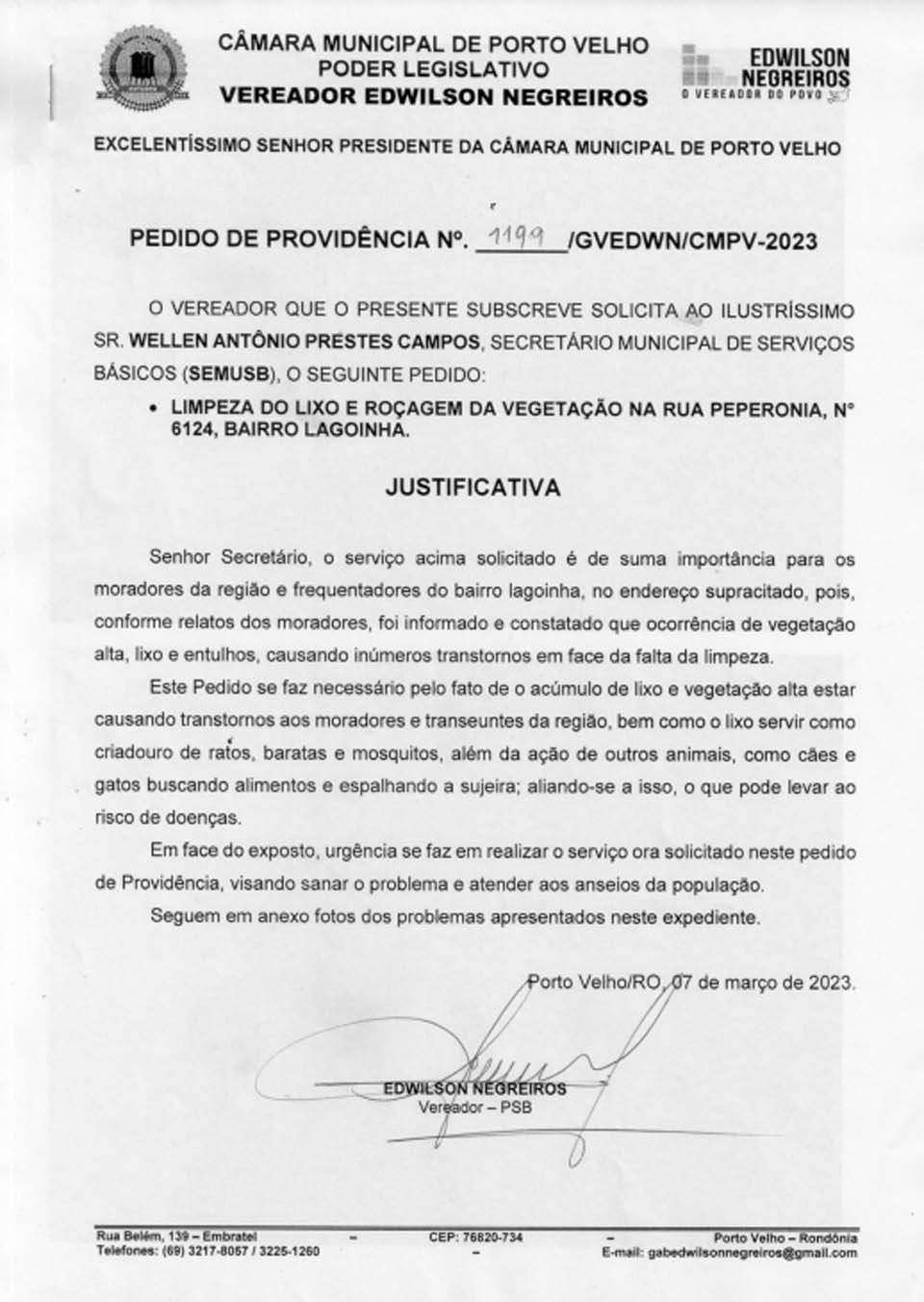 O vereador Edwilson Negreiros, do PSB, enviou um Pedido de Providência à titular da pasta municipal de Serviços Básicos (SEMUSB), Wellen Antônio Prestes Campos, solicitando a realização de serviços de limpeza de lixo e roçagem da vegetação em um trecho específico da Rua Peperonia, localizada no Bairro Lagoinha, zona Leste da capital.