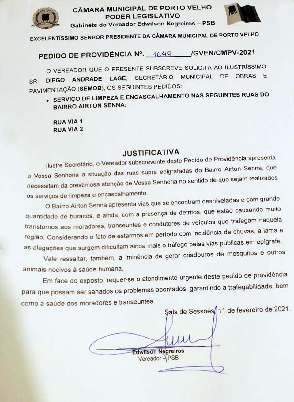 O vereador Edwilson Negreiros, do PSB, apresentou Pedido de Providência à Secretaria Municipal de Obras e Pavimentação (SEMOB) solicitando limpeza e encascalhamento em duas vias do Bairro Ayrton Senna, Zona Leste da Capital.