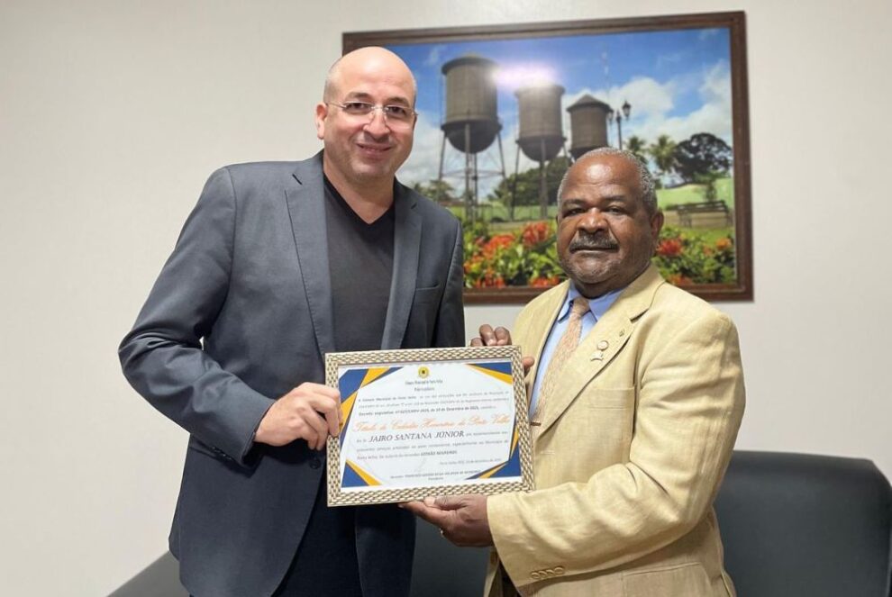 A Câmara Municipal de Porto Velho concedeu, por meio do Decreto Legislativo nº 627/CMPV-2025, o Título de Cidadão Honorário de Porto Velho ao senhor Jairo Santana Júnior, em reconhecimento aos relevantes serviços prestados ao povo rondoniense, especialmente à comunidade da capital. A homenagem é uma iniciativa do vereador Gedeão Negreiros (PSDB), autor da proposição aprovada pelo Legislativo municipal.